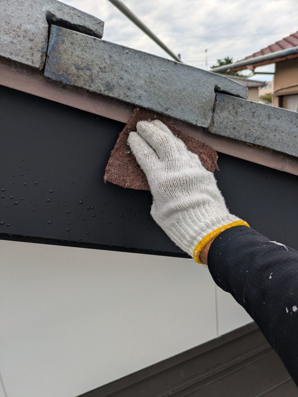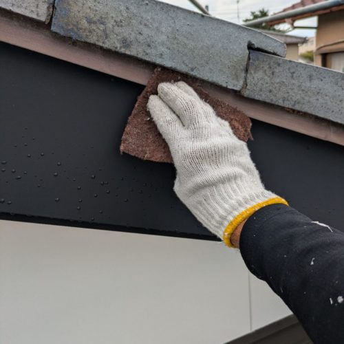 塗装メンテナンスの一環として壁の養生と倉庫付帯部の塗装を行いました。建物の美しさと耐久性を守るため、見えない部分にも細心の注意を払っています。